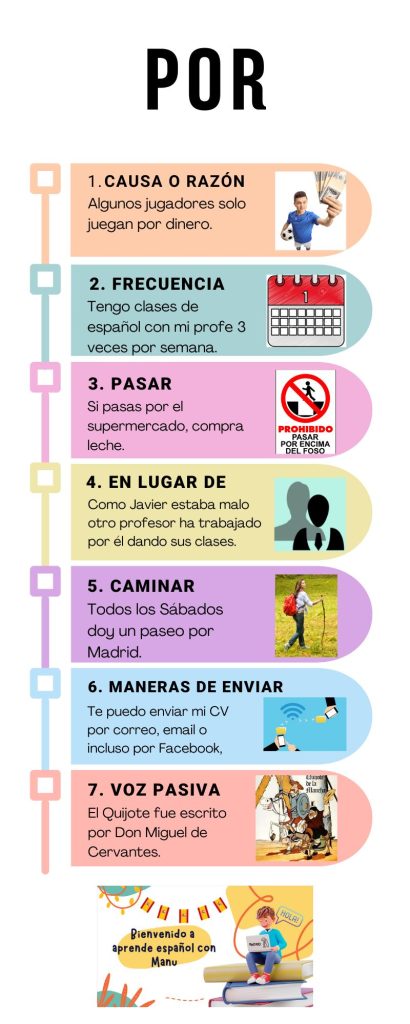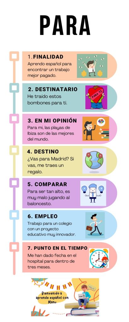 3. Uso práctico de la mnemotecnia: Un truco común es recordar que «para» suele asociarse con el destino o finalidad (piensa en «destino» o «para» en inglés), mientras que «por» tiene más que ver con la causa o el medio (piensa en el recorrido).